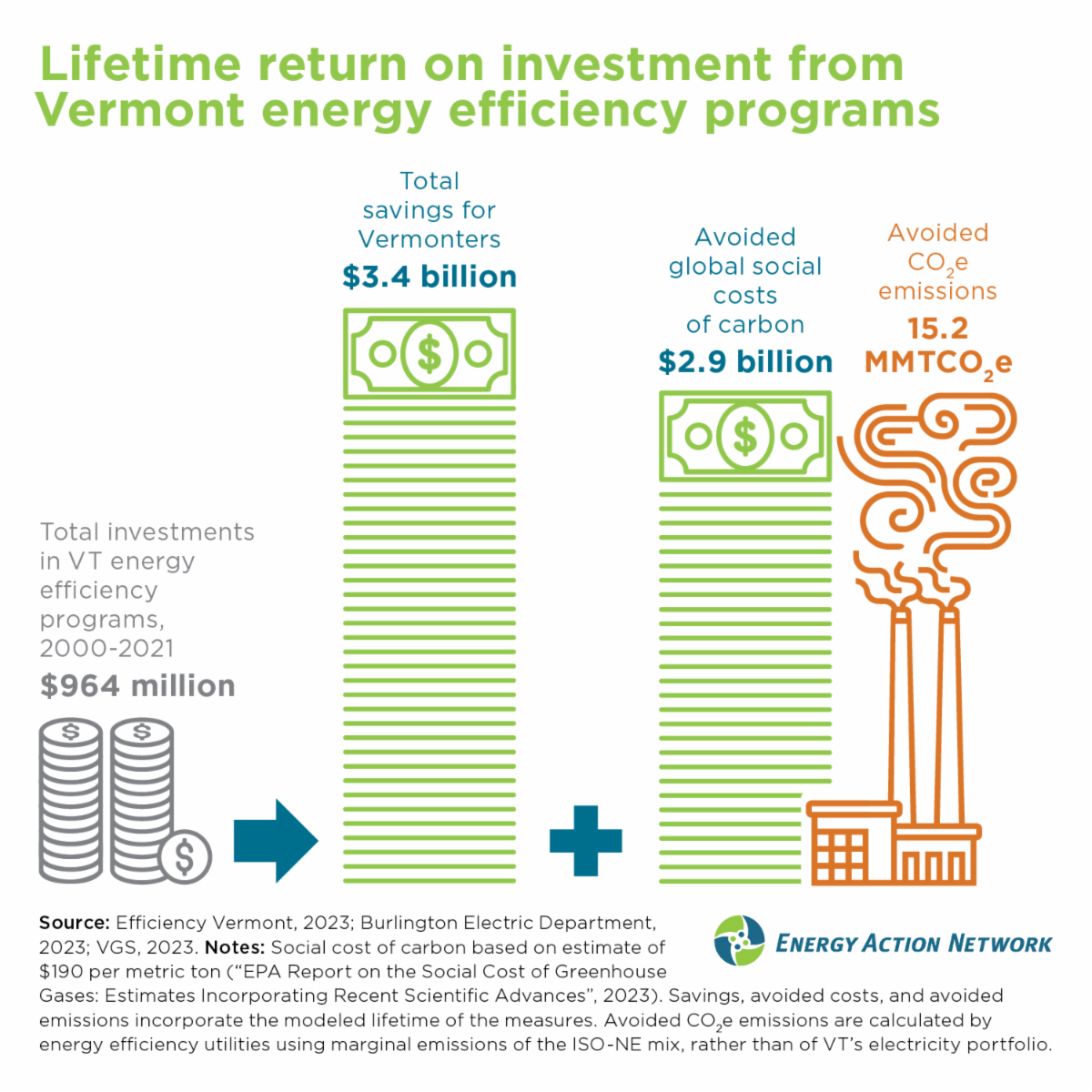 In all, $964 million in efficiency investments by Efficiency Vermont, Burlington Electric Department, and VGS resulted in total savings of $3.4 billion for Vermonters between 2000–2021. These investments are also estimated to avoid $2.9 billion in societal costs.