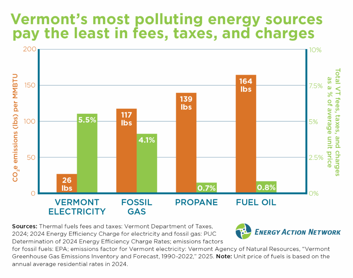 A key source of investment to support energy efficiency and beneficial electrification comes from fees, taxes, and charges on energy purchased in Vermont, ranging from 0.7% to 5.5%, depending on the heating fuel. Fossil heating fuels such as fuel oil and propane pay one sixth of the fees, taxes, and charges that electricity does, despite producing 6 times more climate pollution. This puts upward pressure on the price of electricity, Vermont’s cleanest energy source, and is inconsistent with the “polluter pays” principle.