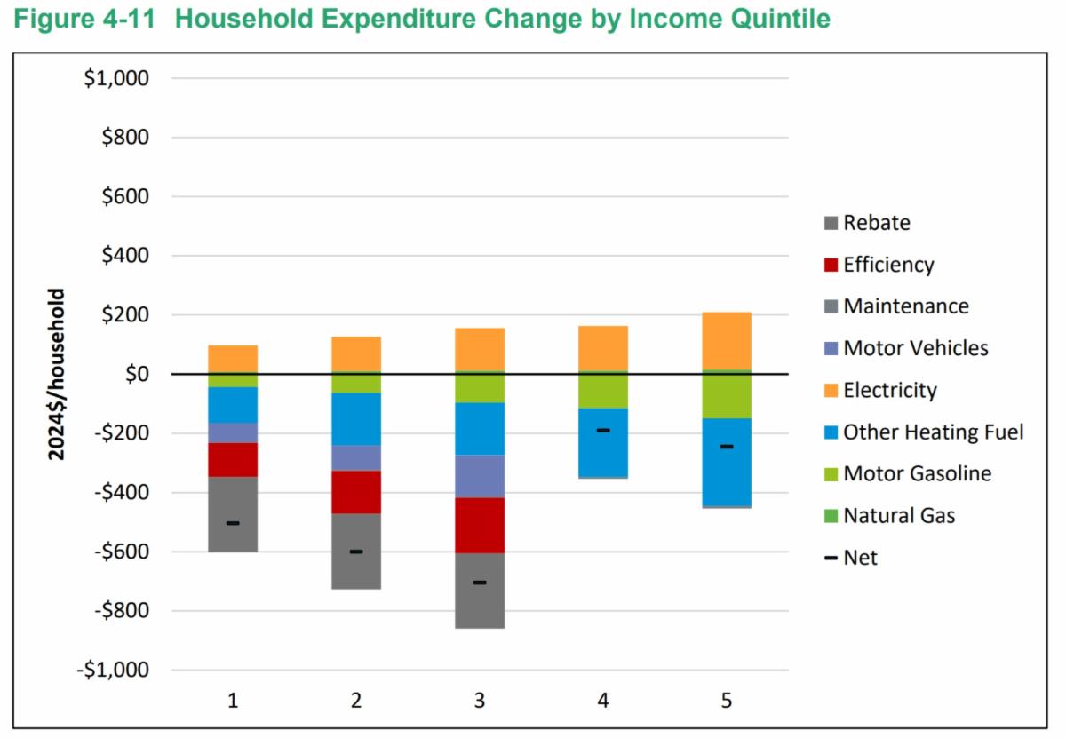 In 2024, the Agency of Natural Resources and Vermont Agency of Transportation commissioned Cambridge Systematics to develop an Assessment of a Cap-and-Invest Program for Vermont to support meeting the State’s commitments to equitably and cost-effectively cut climate pollution, as directed by the Global Warming Solutions Act. This graph from that report models potential household savings in 2030 for a cap-and-invest program covering transportation and thermal fuels. It shows that most households could benefit if the state were to reinvest 50% of proceeds in emissions-reducing activities, including targeted incentives for lower- and middle-income Vermonters, while dedicating the remaining funds to direct rebates to households in the lowest three income quintiles. While the report notes that “individual households will see different cost changes depending upon their specific fuel mix and consumption level”, the graph illustrates how a cap-and-invest program can be designed to result in a net decrease in expenditures for most Vermonters. Specifically, this graph shows $500-$700 a year in average savings for the 60% of Vermonters with lower and middle incomes, in addition to average savings of around $200 a year for upper-middle and upper-income Vermonters.