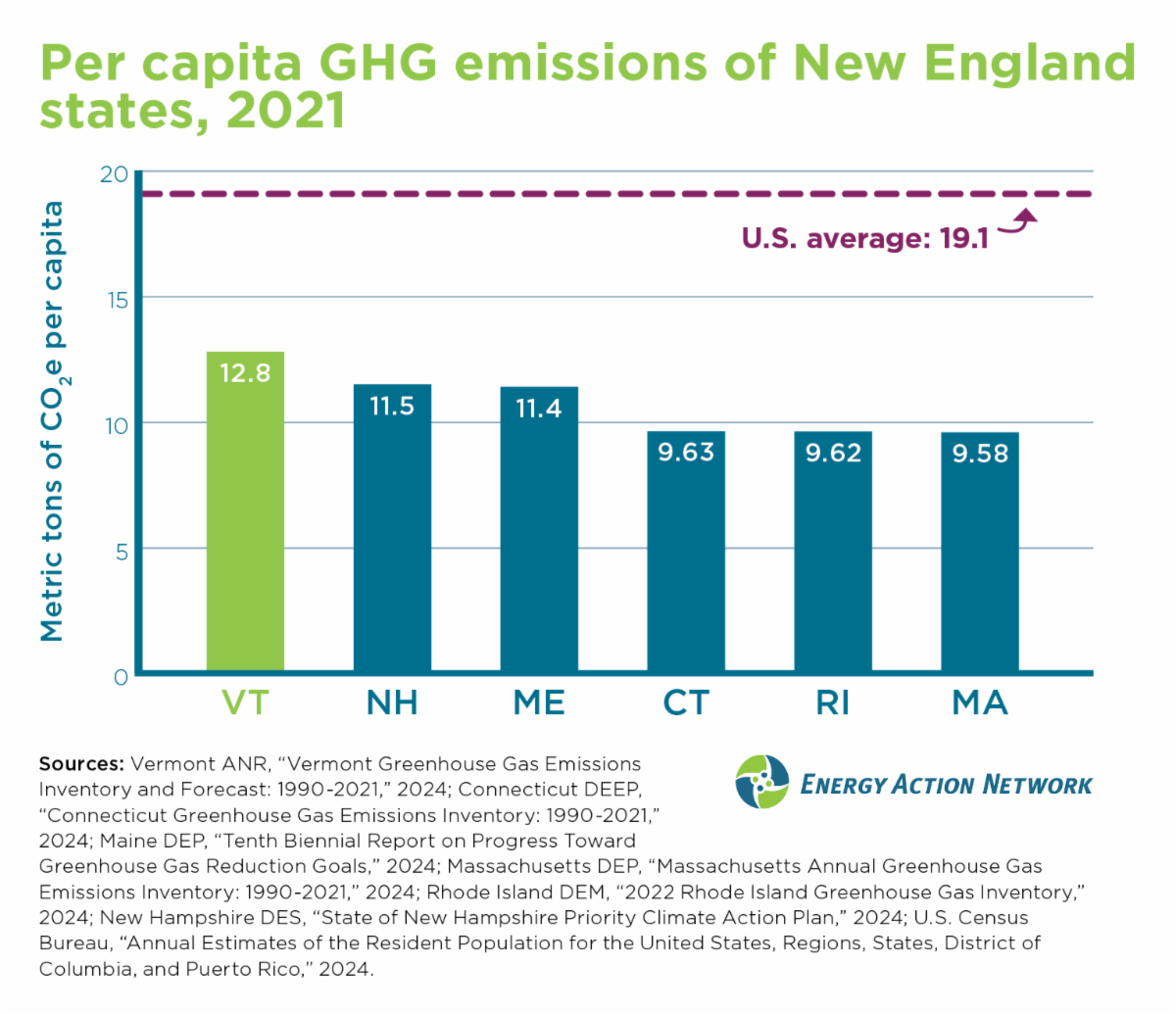 Based on the latest data from 2021, Vermont has the highest per capita GHG emissions of any state in New England, and we have also made the least progress toward meeting the 2025 target of the Paris Agreement. Our research paper, “Assessing Vermont’s climate responsibility: A comparative analysis of per capita emissions,” analyzes greenhouse gas emissions inventories from the six New England states to understand where Vermont stands relative to our neighbors. This report was originally published in 2023 and was recently updated to incorporate 2021 data.
